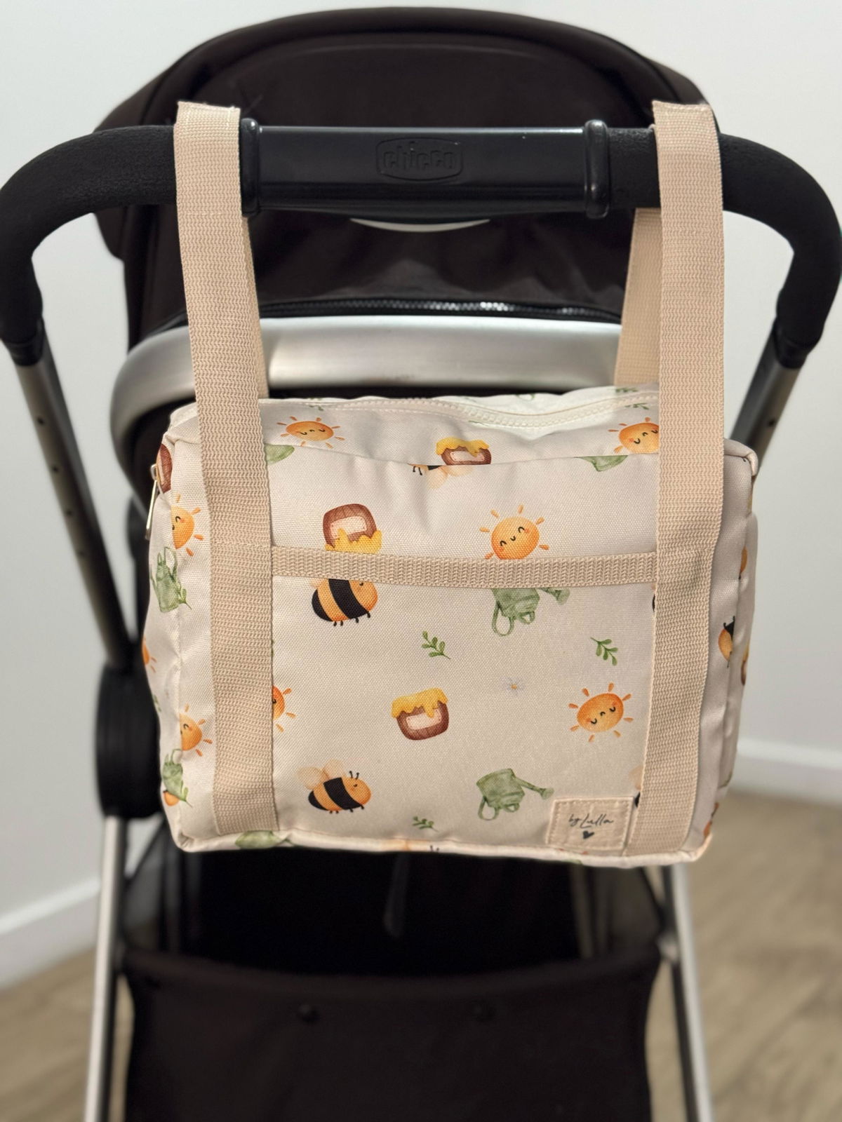 Además, cuenta con un bolsillo externo diseñado especialmente para tus pertenencias más personales, como DNI, tarjetas, llaves y dinero. Y gracias a sus dos correas ajustables, podrás adaptarlo fácilmente a cualquier cochecito.