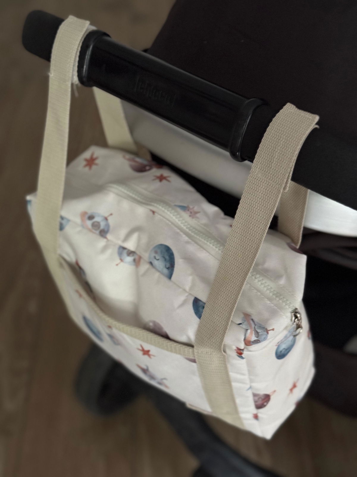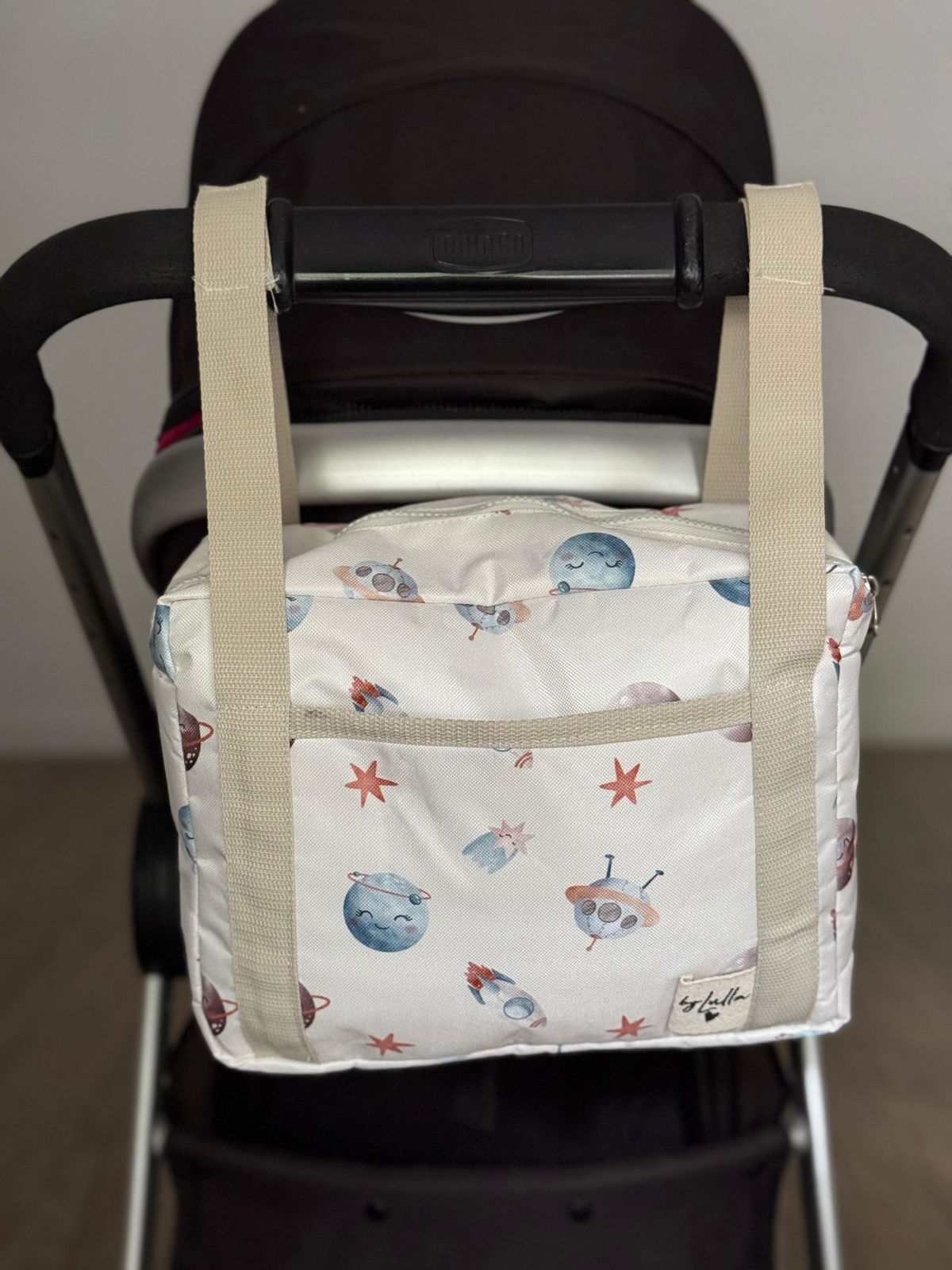 Además, cuenta con un bolsillo externo diseñado especialmente para tus pertenencias más personales, como DNI, tarjetas, llaves y dinero. Y gracias a sus dos correas ajustables, podrás adaptarlo fácilmente a cualquier cochecito.
