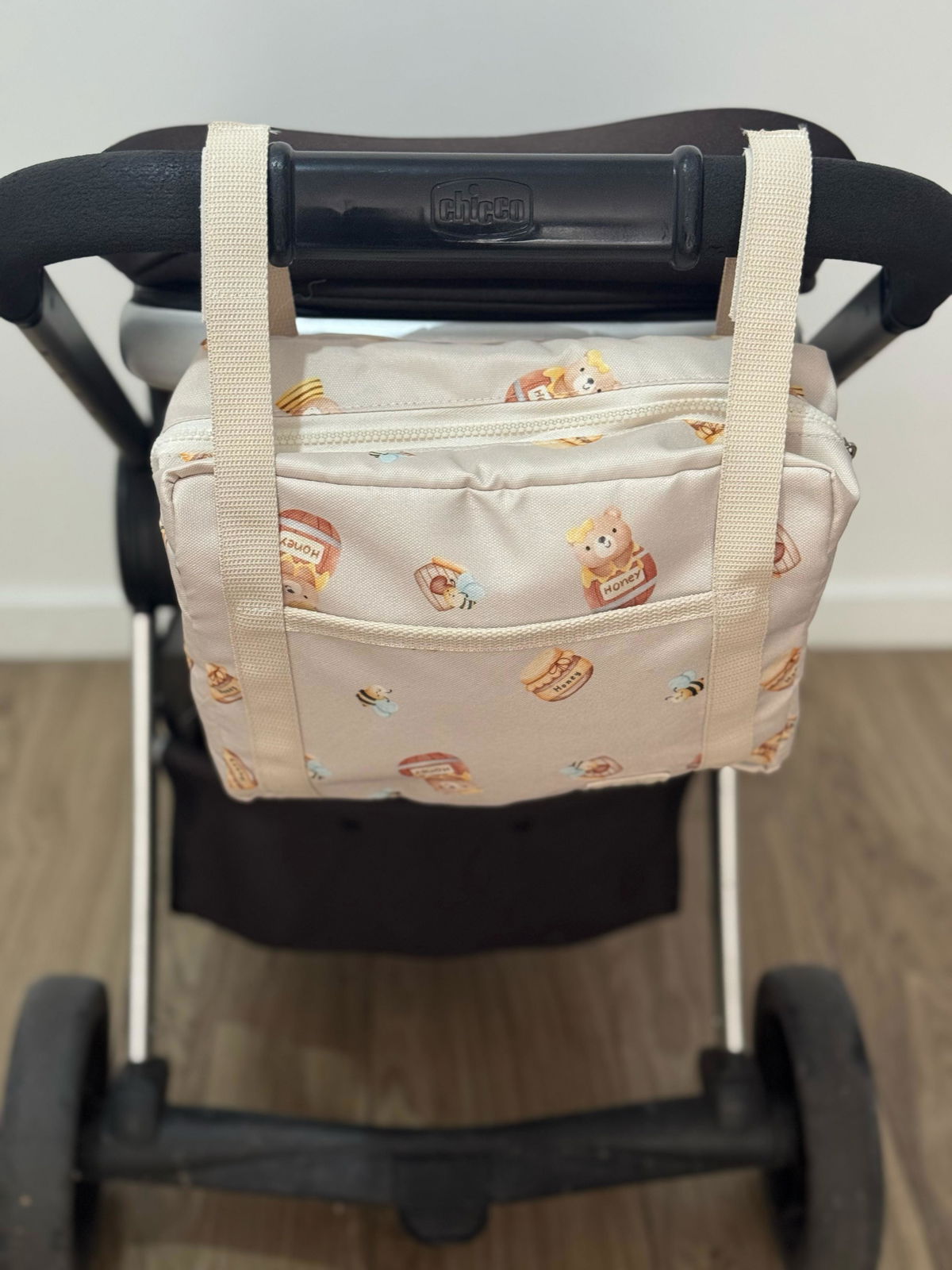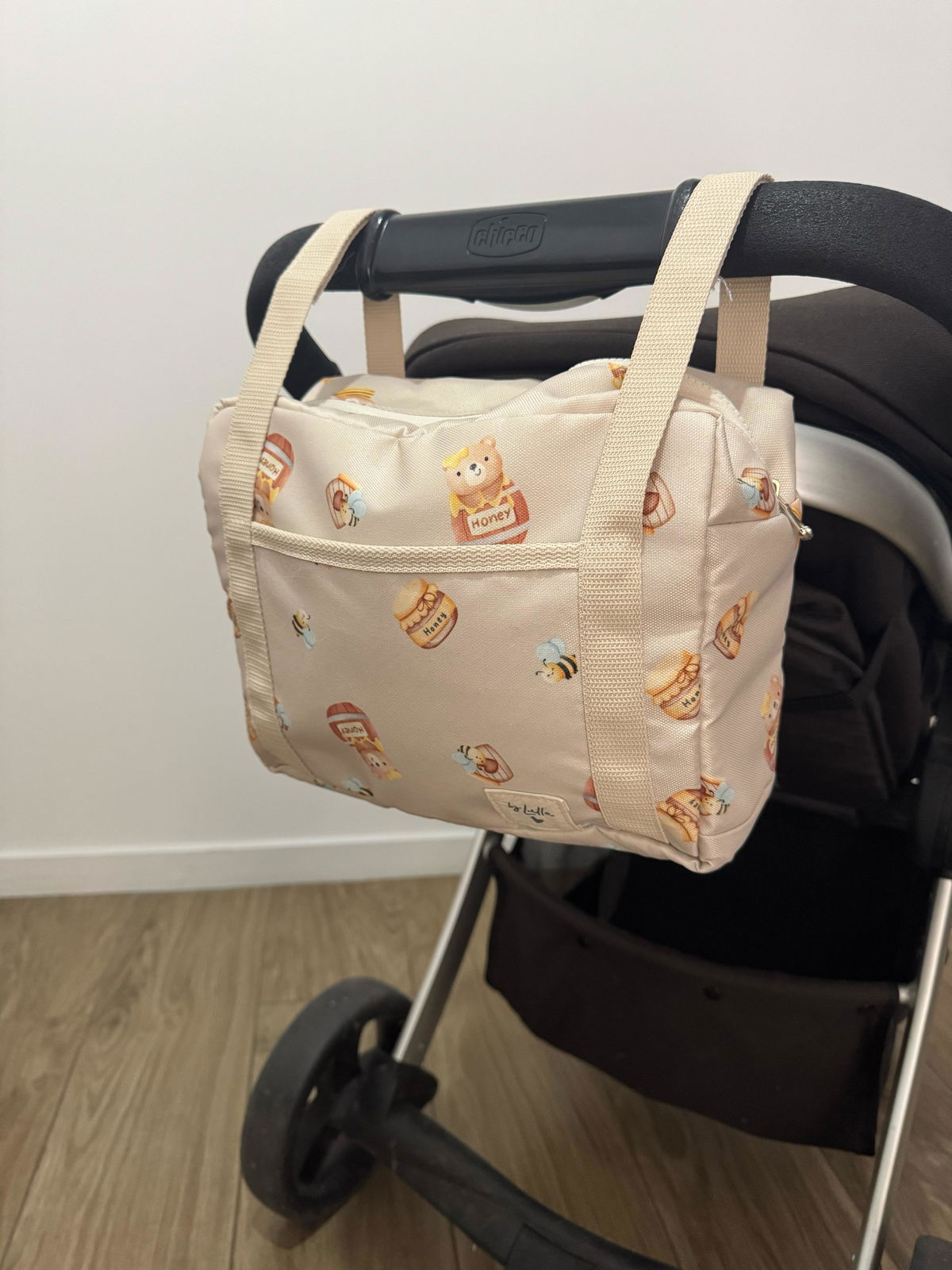 Además, cuenta con un bolsillo externo diseñado especialmente para tus pertenencias más personales, como DNI, tarjetas, llaves y dinero. Gracias a sus dos correas ajustables, podrás adaptarlo fácilmente a cualquier cochecito.