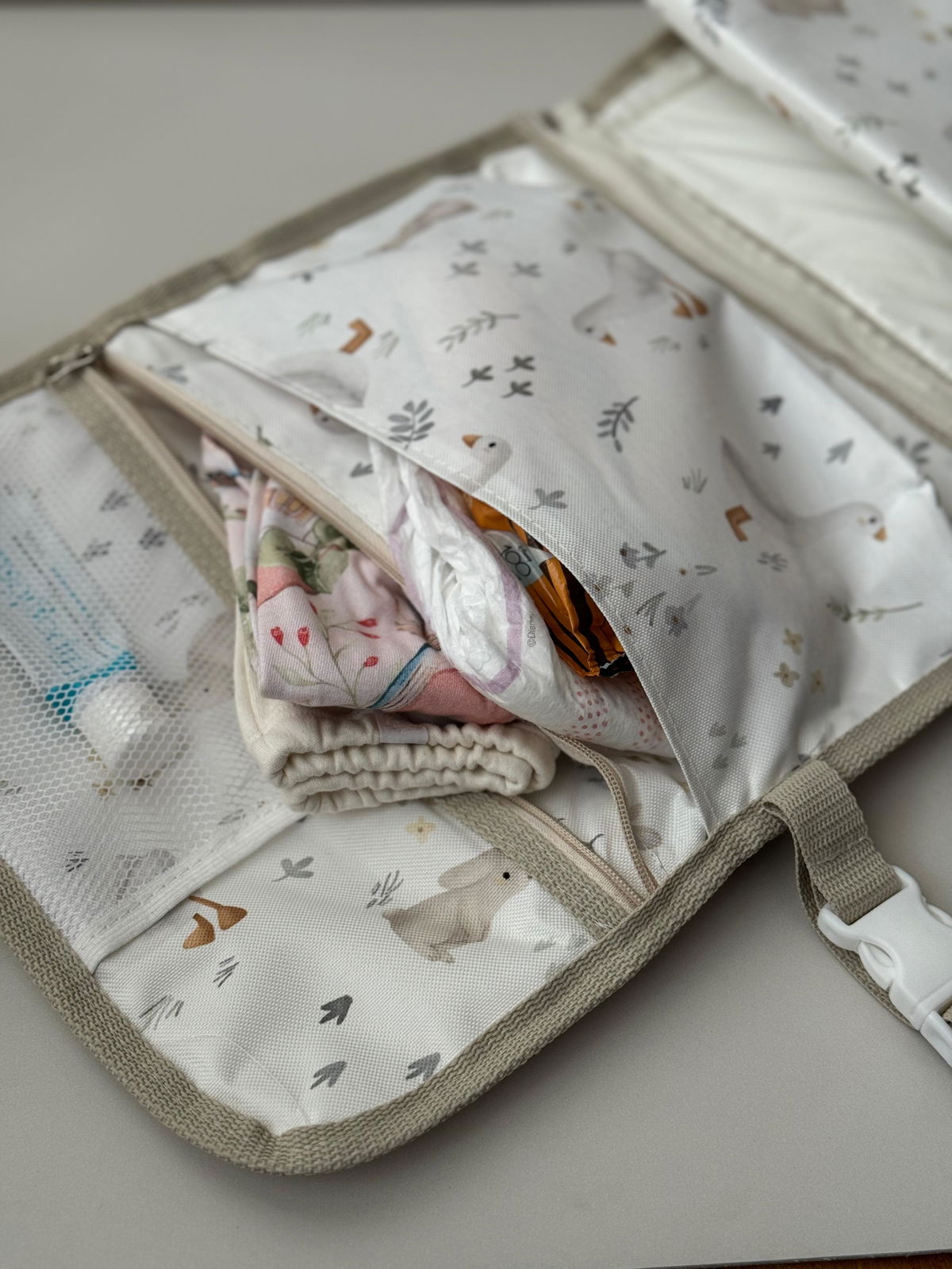 El cambiador incluye un cierre que permite separarlo fácilmente del bolso principal, proporcionando versatilidad y comodidad. Además, viene con un gancho integrado para colgarlo del cochecito, manteniendo todo al alcance de tu mano durante los paseos.