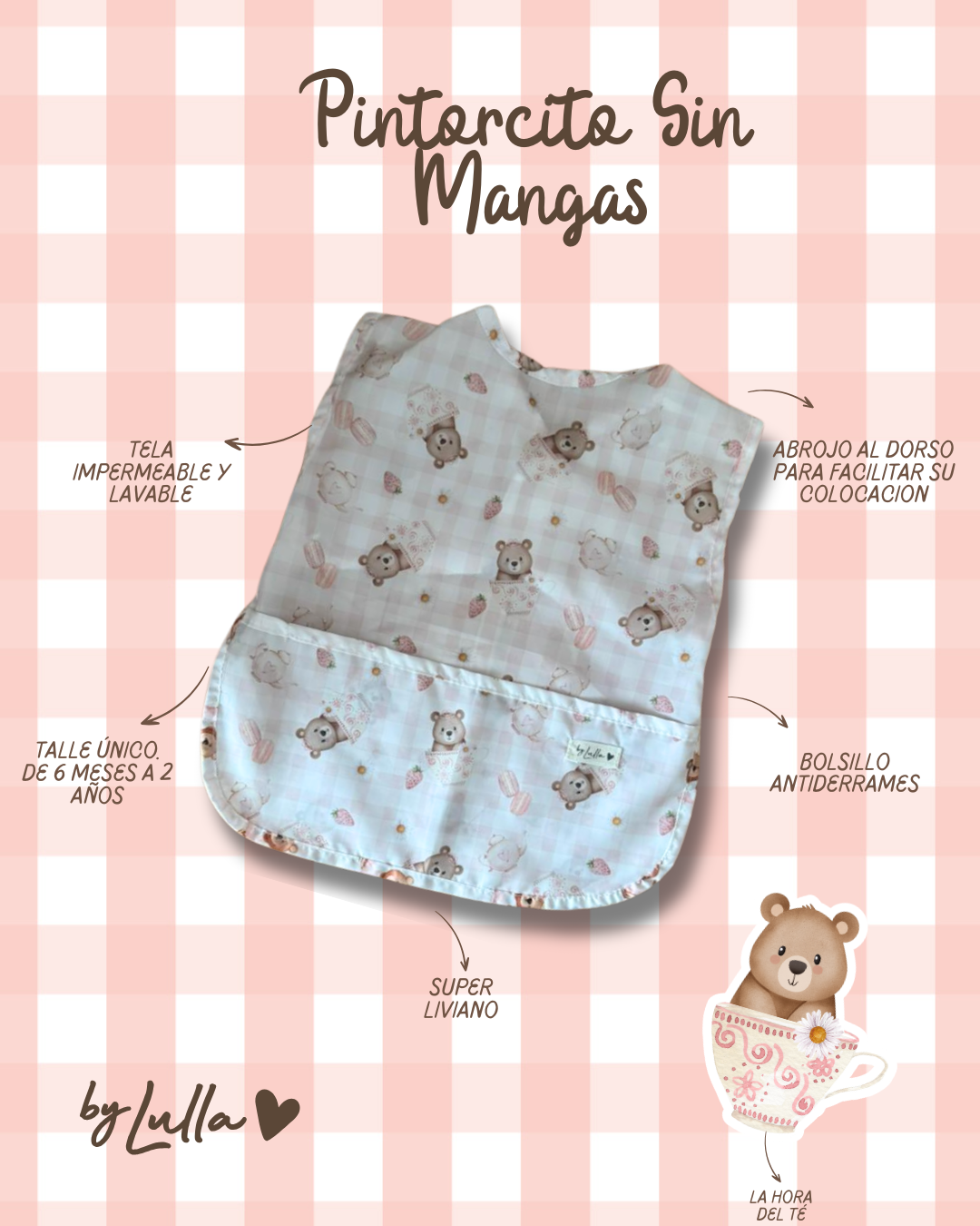 Están confeccionados con material impermeable y cuentan con un práctico bolsillo delantero "atrapa todo" que ayuda a contener derrames o migas.