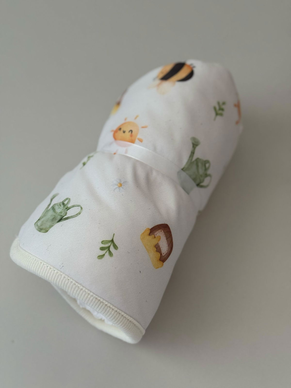 Toalla con capucha 100% algodón doble felpa, con capucha externa estampada.