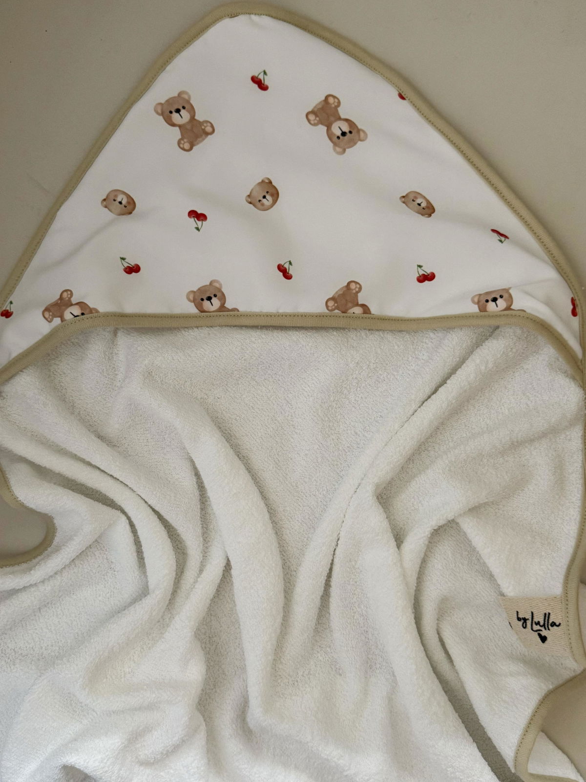 Toalla 100% algodón doble felpa, con capucha externa estampada.