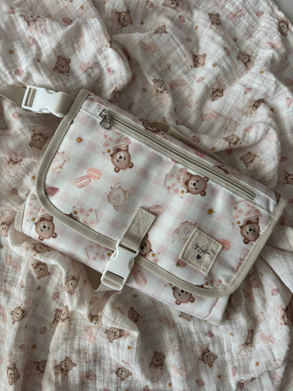 Kit cambiador súper amplio y práctico, diseñado para facilitar el cuidado de tu bebé en cualquier lugar. Este kit cuenta con múltiples bolsillos organizadores para llevar pañales, toallitas húmedas, algodón, cremas, ropa y un bolsillo externo dedicado a tus pertenencias personales.
